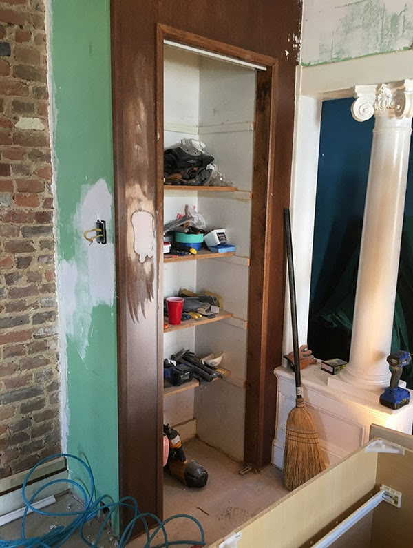 Even the little existing pantry closet got a lot of attention, and actually fits in now! I wish it was just a few inches shallower and didn’t overlap the original moldings, but in terms of working with what you’ve got…it’s a huge improvement! The bifolds got painted and new hardware, and I added another simple casing to match the window and original moldings with a simple 1×6 baseboard with a stock base cap to finish it off. I had to play dirty to get those moldings…Dad (Chris) said no because he was worried about time so, ya know, I had to go ask Mom (Julia) who gave me the go-ahead. I’m the worst! Scotty built out the top with a few pieces of framing lumber, 3/4″ plywood, and cove molding to bring the height up to the ceiling.