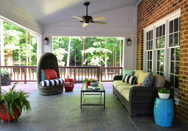 Those are pillows from the open sunroom on the back of our house, shown below shortly after we finished it back in 2014. We leave most of the furniture out year-round since the area is covered and we find ourselves plopping down on the couch even on mild winter days (I’ve even watched the kids play in the snow from it a couple of times!). But it does take a beating in the early spring when every surface in central Virginia gets coated in a thick layer of tree dandruff. So if you’re not emotionally prepared to see lots of grimey, dingey, pollen-covered stuff, this may not be the post for you.