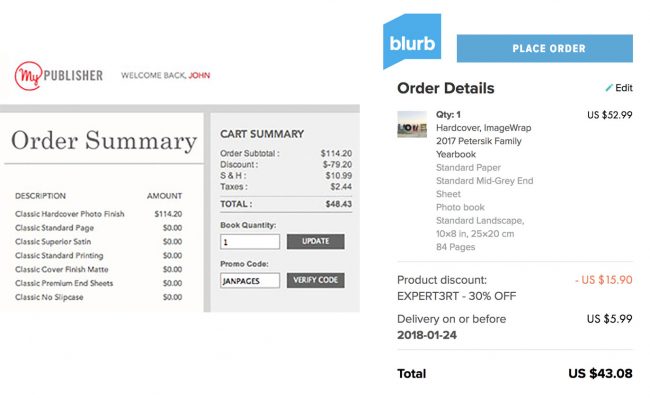 Again, I’m no printing aficionado, but I found no discernable difference between Blurb and MyPublisher’s final product. In fact, I like how Blurb’s spine was a little sharper than MyPublisher’s – although maybe that’s the difference of it being 15 pages shorter.