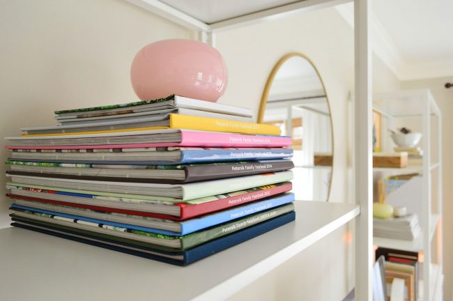 For starters, the spine of their Standard Landscape Photo Book measures just 1/2″ shorter than the old standard size from MyPublisher we used to order, meaning it stacks really naturally on top of our existing collection (it’s the one with the yellow spine below). It’s about an inch and a half less wide too, but you can’t usually tell that when they’re stored flat like this (or leaned vertically now that I think about it) since that’s in the back anyway. I know this seems like a weird thing to obsess over, but part of the fun of making these books has been watching the stack grow. So we’re glad to have found something that allows us to keep building on the same pile.