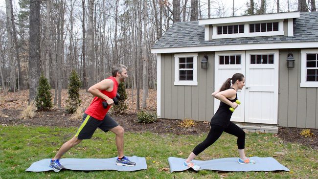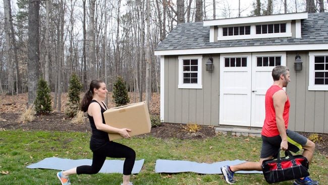 We actually sourced a lot of our “weights” from our garage. Gotta love repurposing! I’m used to lugging our tool bag around, but incorporating a walking lunge was an exciting spin on an otherwise ordinary movement. And Sherry discovered that lunges are a lot more fun when you carry a box of tiling supplies. Who knew?!