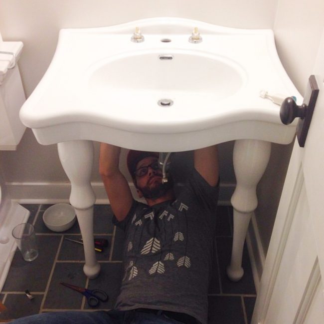 - The photo above shows the console sink that we had a rough time installing. Signature Hardware doesn’t sell this exact model anymore, but you can find some similar ones on this page.
