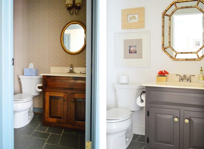 - Below (left) is how the bathroom first looked when we bought it, and the picture on the right shows how we did a quick paint-and-accessories update before embarking on our full-fledged renovation a few years later.