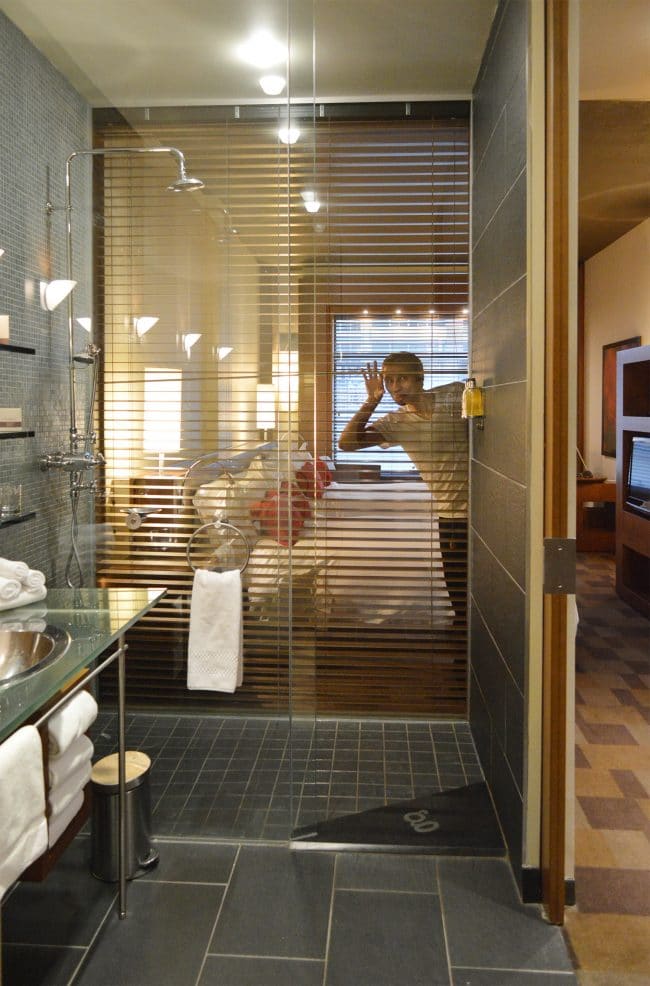 - I also had to laugh when I dug up this photo from way back in 2012 of the other hotel we mentioned from our Toronto book tour stop (still not sure of its name). We remembered the glass shower had blinds, but I’d forgotten that they were on the outside of the shower – so the person in the shower wasn’t in control of whether they stayed closed! HA!