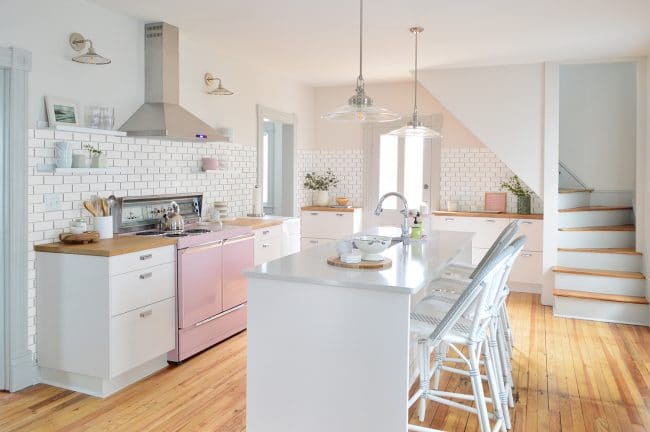 Let’s start with the smallest option. Since we don’t have upper cabinets, finding a natural stopping point for the backsplash was our main challenge. We knew a standard 18″ backsplash would probably look too low in such a lofty room (the ceilings are 9′ downstairs at the beach house) and we also thought it might look even more awkward with the extra-tall back panel of our range sitting in front of it (it’s around 10″ above the counter).