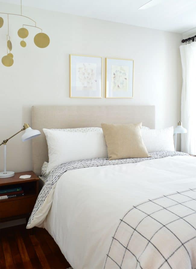 The middle bedroom has sort of a warm/brass thing going on. It started with the lamps, then I added some of my favorite gold frames with handmade prints that I picked up at a local craft fair last year, and we even hung a mobile in one corner. I can’t explain how simple this room was to put together (matching side tables, matching lamps, two pictures, simple curtains, neutral headboard and bedding, etc) but it feels so serene and beachy. The breezy gold mobile is like the icing on the cake.