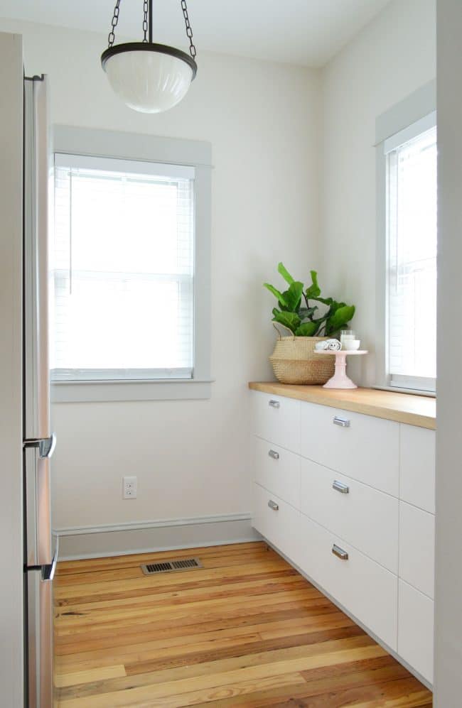 Assembling and hanging the cabinets wasn’t hard (we built them one Friday night and installed them the next Saturday morning) but we always forget all the little dangling to-do list items after that, like adding the hardware, cutting new counters, and reinstalling the baseboards and toe-kicks. We finally got that done this past weekend. They just need some paint touch ups and they’ll be 100% completed. Have I mentioned the pantry is one of my favorite rooms in the entire beach house and I wish so badly I had one in our kitchen at home? That pendant is original and we had it rewired so it’s all safe and updated. (*Insert dreamy lovestruck sigh here*). Note: you can see how we built the shelves along the left wall of the pantry here.