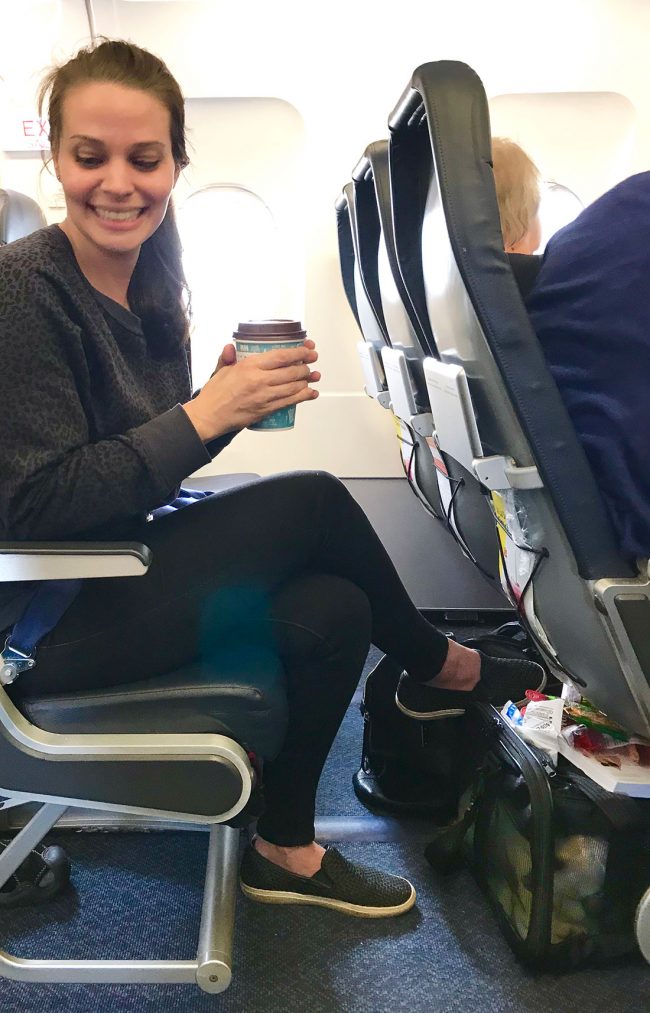 - We didn’t get a shot of ourselves and all of the stuff that we hauled through the airport (our hands were pretty full!) but here’s Sherry on the plane sporting what she calls her “signature crazy hair and that nervous-mom travel face.” The point of this picture is really to point out one of our favorite travel companions: Burger, who’s in his carrier under the seat.