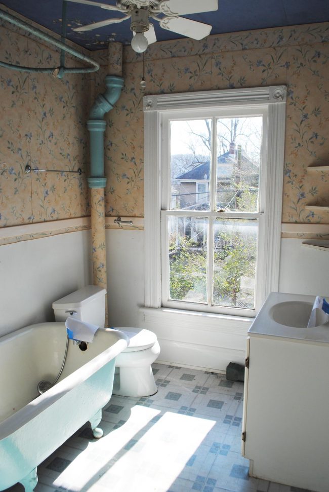 And now for a bathroom before. I know what you’re thinking. “How thorough of them to wallpaper the bottom half of that pipe.”