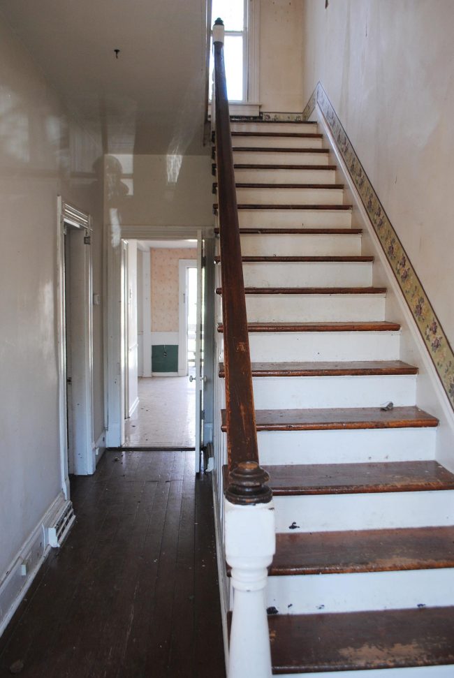 They reused or brought back as many historic elements as they could: baseboards, trim, mantles, doors, etc. The many dated layers of wallpaper, however, didn’t make the cut. Although creativity points for this use of a border along the stairway by someone years ago (this is a before shot):