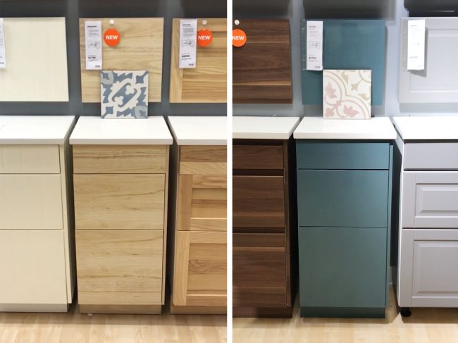 - It’s a little hard to get a sense of tile pattern in those shots above (plus, Ikea’s lighting is blergggg), so these images should give you a better sense of the combos. Here’s the first with the wood cabinets (we won’t use metal pulls like the ones below though) and our blue tile.