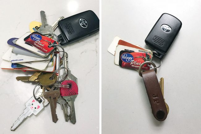 - And now the photos you’ve all been waiting for – the before & after of my key ring, thanks to paring down my keys and my membership/loyalty cards (here’s that Key Ring app I used to digitize my infrequently used cards). This is the leather key organizer I bought on Etsy too. It holds up to 6 keys and/or some loyalty cards.