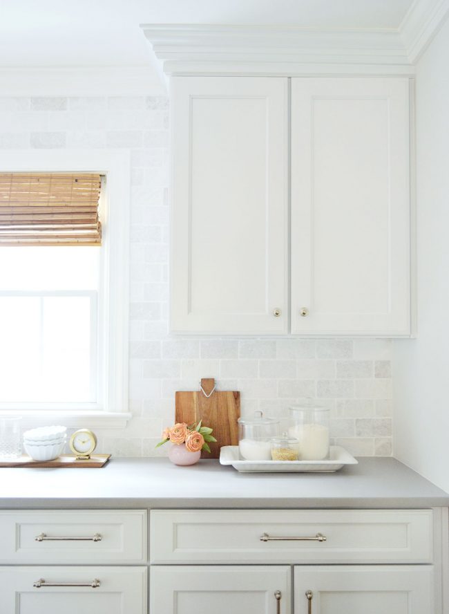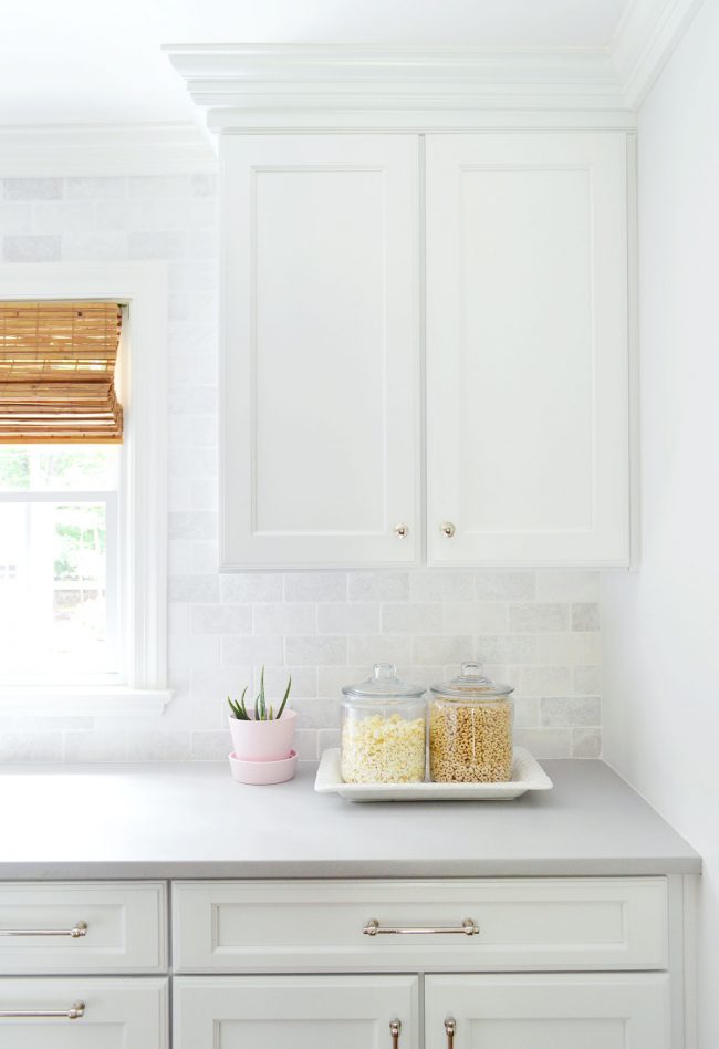 - Here’s the same angle today. There’s still a decorative object (the plant) but we’ve replaced those unused canisters with ones that we actually do use (popcorn & cereal get stolen from them daily). These used to sit on the opposite end of the counter, which felt cluttered whenever we plopped down our grocery bags there to unload them, so now that space is freed up to be used for that without feeling as cramped. The breathing room feels great.