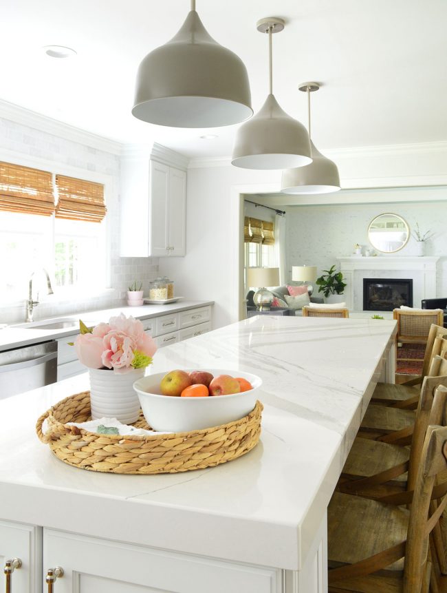 - Here’s the island from the other angle, which shows that there’s still plenty to look at in this room (it doesn’t feel stark, just less styled and filled up than it did before). We also like how clearing the far end of the island lets your eye see through to the living room more easily (the kids are often in there while we’re in the kitchen, so it’s nice not to have stuff blocking the view anymore).