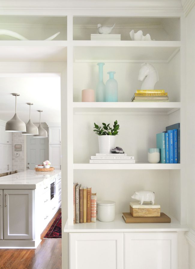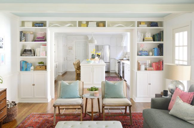 - Moving into the living room, this is what the built-in bookcases looked like after we made them and filled them to the brim with colorful books and objects (learn how we made them here!).