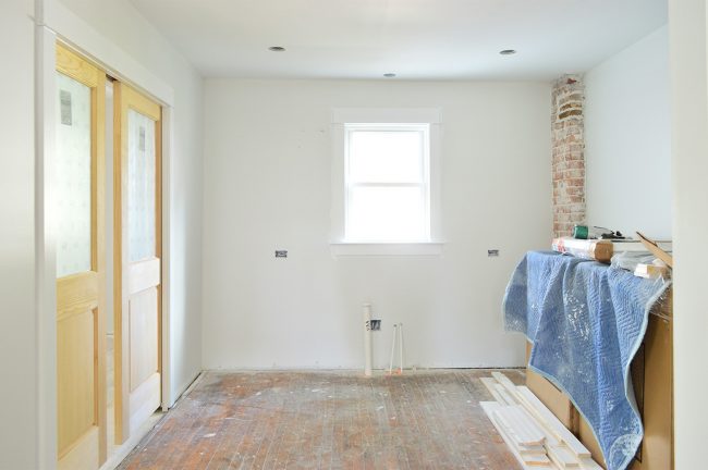 - I know some of what we described in this episode will make more sense with these photos, so let’s start with this picture of the kitchen we took last month. This is actually of the RIGHT side, but I flipped it since all of my renderings show the LEFT side. I figured it would be easier to follow that way. I’m standing in the living room and the wood doors on the left open to the mudroom / laundry room, and you can see the exposed brick chimney there in the back right.