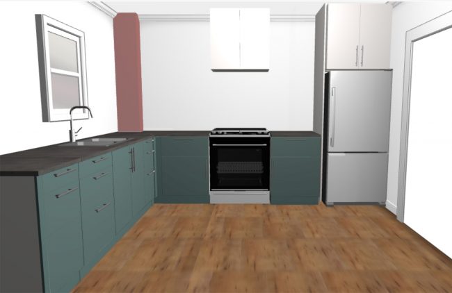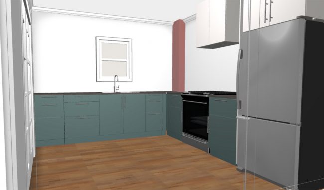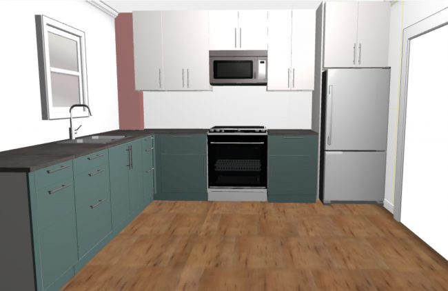 - You can see how the upper cabinets conceal a lot of the exposed brick (shown in red – although in real life they’re pretty whitewashed – see the kitchen photo). NOTE: We’re only ordering cabinets from Ikea, so the appliances, hardware, and countertops are just placeholders. This also doesn’t show things like our patterned tile and open shelves, so you’ll have to use your imagination.