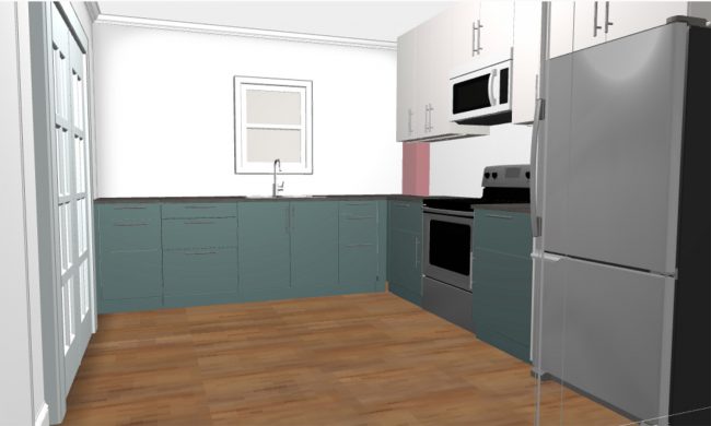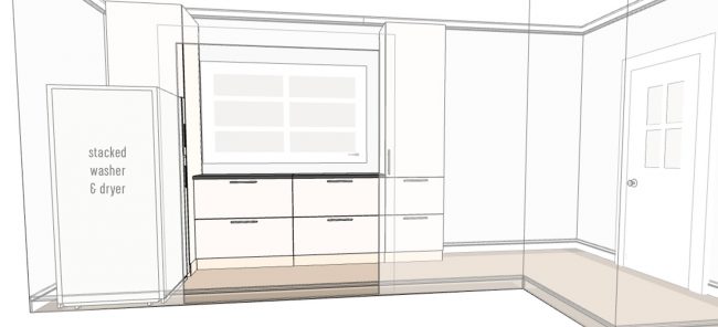 - The rendering below illustrates some of the cabinetry we’ll be gaining in the adjacent mudroom to create a nice pantry-ish extension from the kitchen. That wide doorway is where those wood pocket doors were in the original photo – so these cabinets would only be about 5 steps from the sink. Ikea isn’t great for rendering laundry spaces (which is why my washer & dryer is actually a refrigerator) but you get the idea. And above the washer & dryer will be a cabinet to the ceiling.