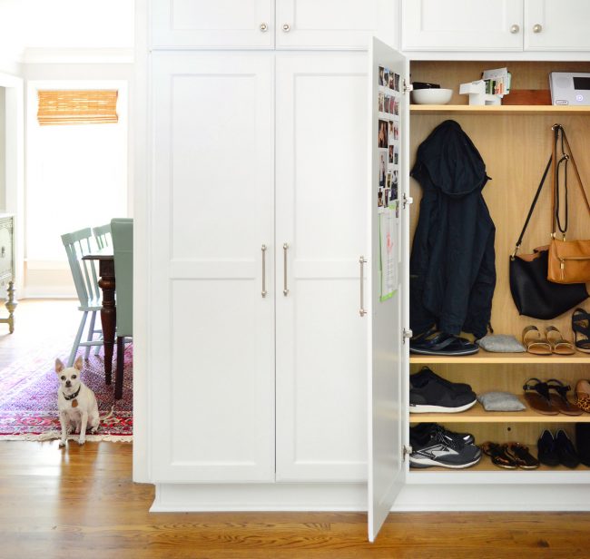 - Below you can see how our makeshift “mudroom” that’s situated in our kitchen (more on that here) but you can also read about how we actually considered adding a proper mudroom (emphasis on the ROOM part) in this kitchen floor planning post.