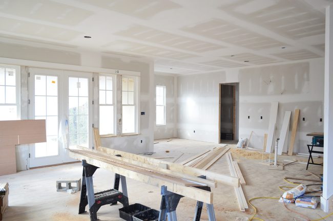 - I wanted to share a photo of how the open concept living area at our showhouse made it more challenging to decorate, but I don’t think we took any “after” pictures showing it from this far back (where you can see all three zones) – but here’s an in-construction photo that shows how seamless the living room, kitchen, and breakfast nook were. You can tour the full house here.