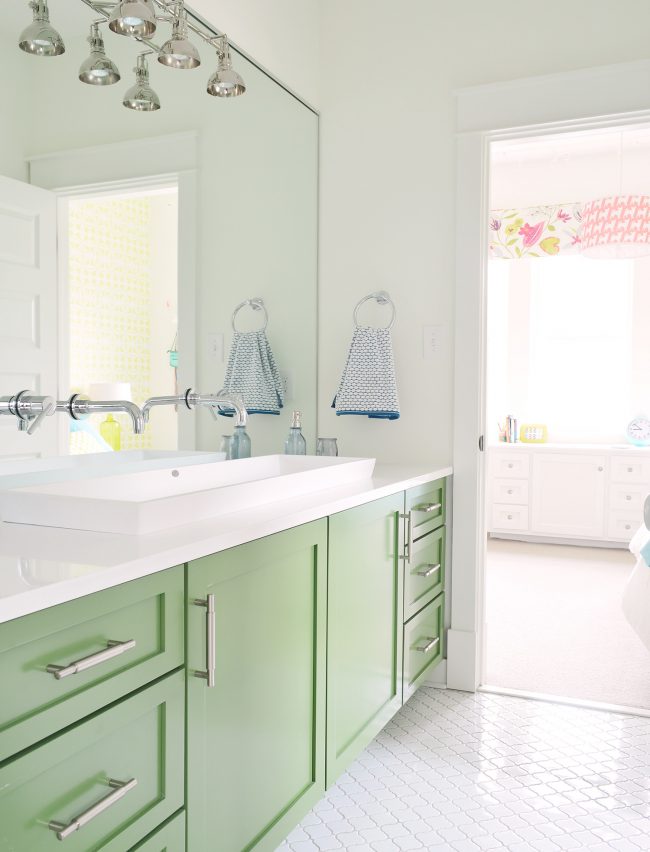 - Lastly, since we asked your opinion about jack-and-jill bathrooms, here’s the one we designed for that same showhouse. This green vanity was in the room that connected the two kids’ bedrooms and behind another door was the toilet, shower, and tub.