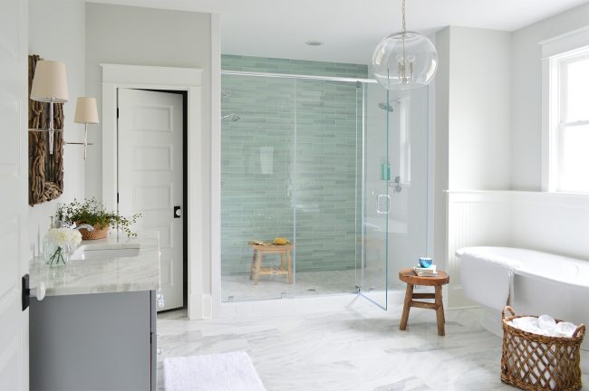 - Below is the master bathroom in the showhouse where you guys convinced us (thank goodness!) to put in a water closet so the toilet could be behind its own door (more on that here). You can find more finished photos of this room (and sources, etc) here.