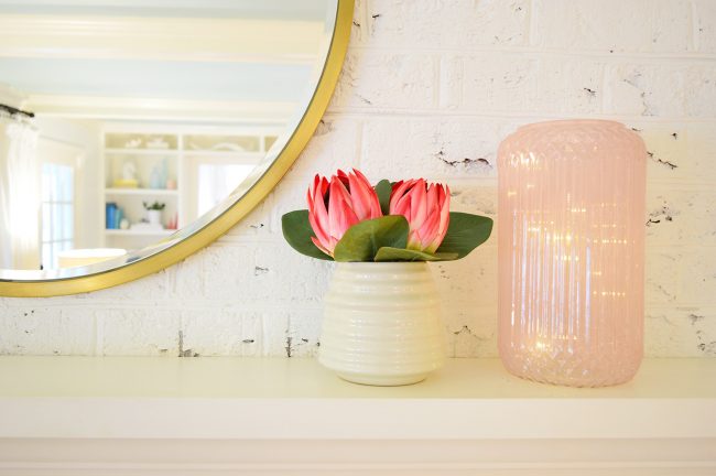 I kept the mantel simple this year with one of my favorite big pink bottle brush trees (it’s from Target years ago but here’s a similar one). I also added a pink mercury glass tree that I picked up (one of my only holiday buys this year – they’re just so sweet I couldn’t resist – and they have little lights inside that glow thanks to two small batteries in the base).